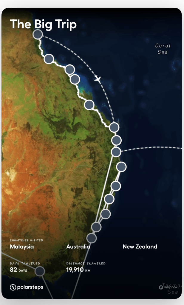 My itinerary was Sydney > Port Nelson/Stephens > Port Macquarie > Coffs Harbour > Byron Bay > Gold Coast/Coolangatta > Noosa > Hervey Bay > Rockhampton > Mackay > Airlie Beach > Townsville > Cairns.