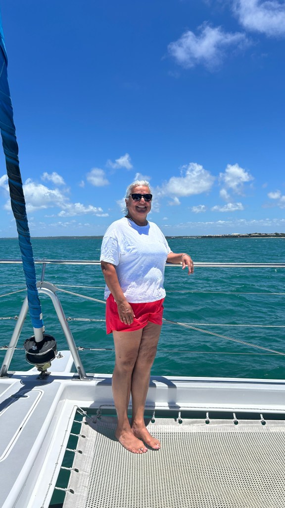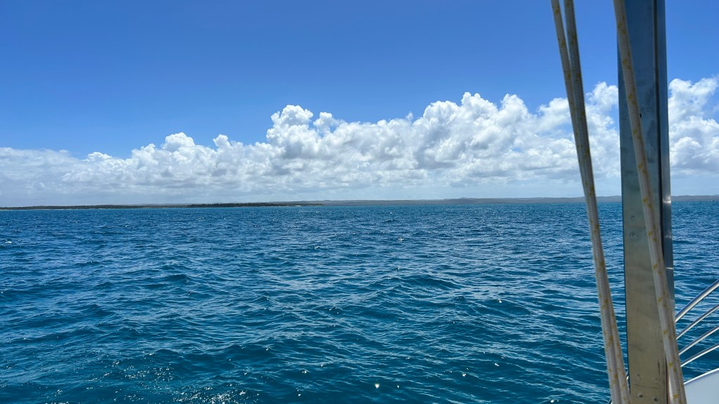 Anyhooooo, I decided to do a boat trip around the area to watch for dolphins and sail up to K’gari. The captain Pete, is apparently a local celebrity when it comes to whale watching and is consulted widely by the industry. There was the usual caveat that most of the time they spot dolphins but you never know. It was a lovely day, Pete and his wife were really knowledgable, we saw bottle nose dolphins and the local ones, that I can’t remember the name of, but they are blue finned. We saw a few pods, so serene and beautiful, Pete was very cautious around them and tried to keep the engines down and kept things calm. There was a local couple on board that were a bit sceptical, their daughter had bought them a voucher years ago and they were just using them up! There were 2 other young British couples and we had a really good time. The local couple were very entertaining and admitted that they had a good time! The highlight was spotting a Dugong, no, it had never heard of it either, but it is related to a manatee, but with a dolphin like tail. The story is that sailors mistook them for mermaids. With the Dugong and the dolphins that we saw, I felt very privileged and lucky to be out there on the ocean, seeing things that many may not have the opportunity to. I don’t have any pictures of the wildlife, just of me – sorry – I was too busy watching!